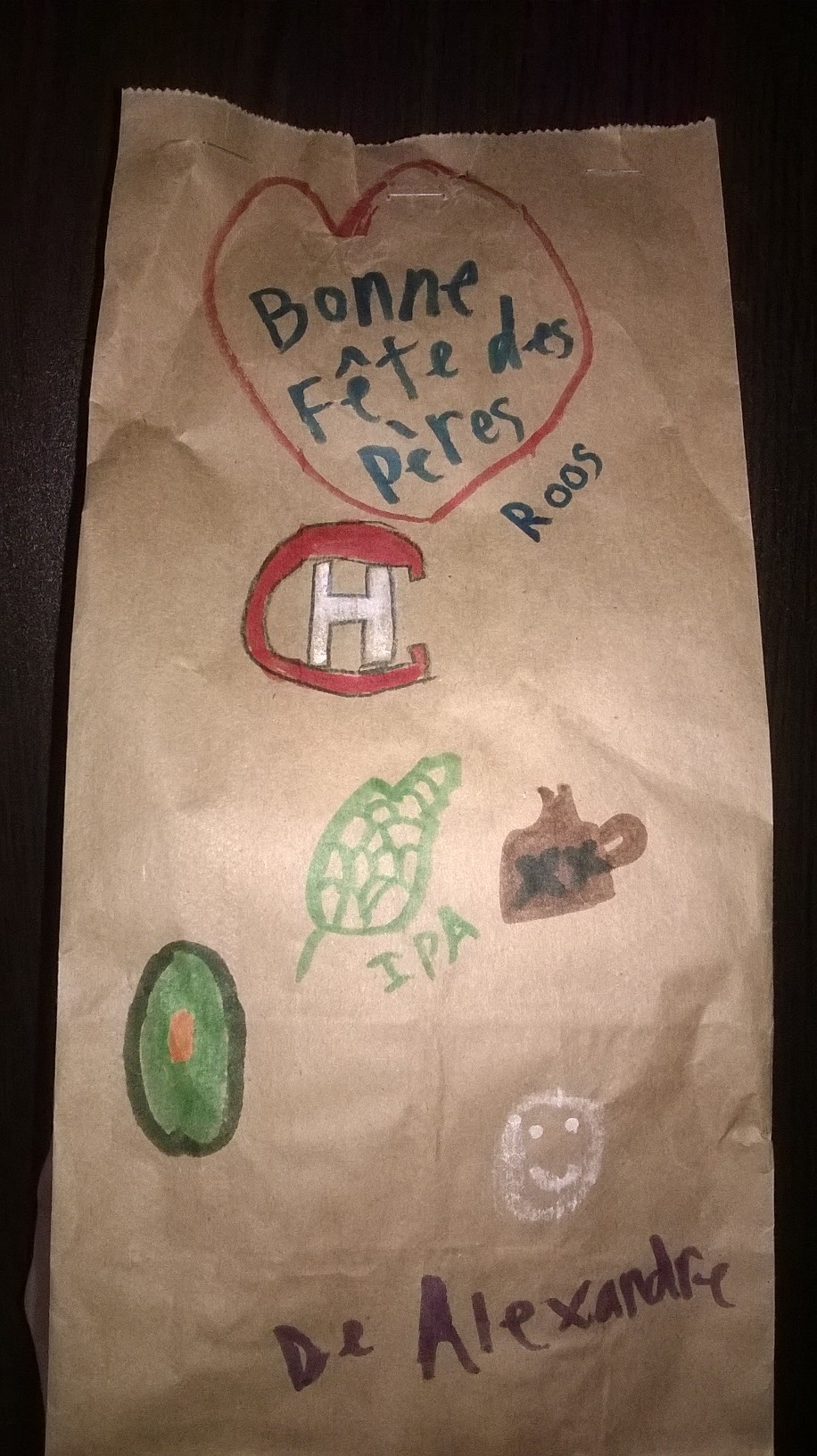 Ouais, c’est la fête des pères et fiston m’a fait plaisir avec son emballage cadeau « home made ». Y a pas à dire, il connaît bien le paternel! Ça fait chaud au coeur, il n’a probablement même pas idée à quel point. Mais le plus cadeau, ce ne sera jamais ce qu’il y aura à l’intérieur du sac. Non, juste sa venue au monde et celle de sa soeurette comblent la grande partie de mon bonheur et de mon existence si futile puisse-t-elle parfois être…