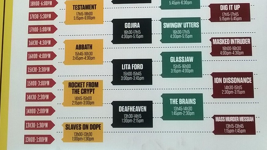 Après avoir suivi quelques recommandations du Houblon Philozique ici même et du sympathique Klimbo sur Musik Universe pour profiter au maximum de ma journée, j’arrive au métro Sauvé avec billet, argent, casquette et bouteille d’eau. Dans une dizaine de stations, je serai sur l’île magique. Première épreuve du jour: une famille de malodorants vient s’asseoir près de moi! Ce n’est pas une blague, je côtoierai de milliers de rockers et de punks à l’hygiène douteuse pendant des heures sous le soleil, devant les stages, dans les lignes d’attente et jamais mon nez ne sera aussi durement mis à l’épreuve que lors de ces quelques minutes en présence de ce clan. Remarquez que c’était peut-être juste l’odeur du père qui prenait le dessus, mais bon dieu de merde, c’est presque impossible sentir aussi mauvais! Une brise de conteneur rempli de viandes avariées aurait été rafraîchissante, ce n’est pas peu dire…